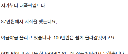 그야말로 대폭락입니다. 아비규환. 자사주 소각이 얼마 됐다고 유증하는건 무슨 심보인지요. 시가부터 대폭락입니다. 87만원에서 시작을 했는데요, 야금야금 올리고 있습니다. 100만