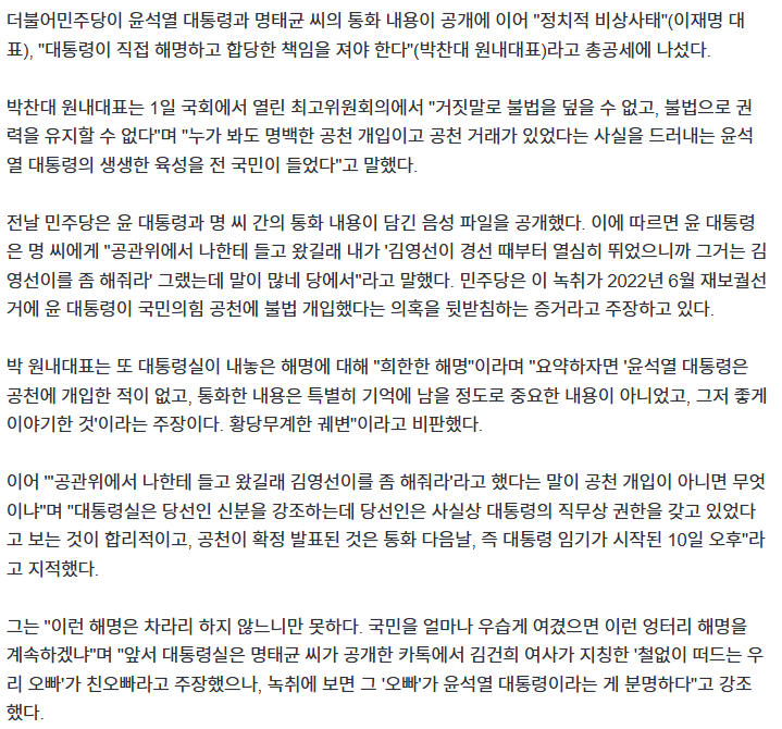 그러면서 특검법에만 몇번째 시도중이고 대통령은 민생법안부터 처리하자하고 대통령 거부권을 쓰고 있으니, 얼핏 잘 모르는 사람들은 윤석렬의 고집불통으로 밖에 보여지지 않을 것이다.