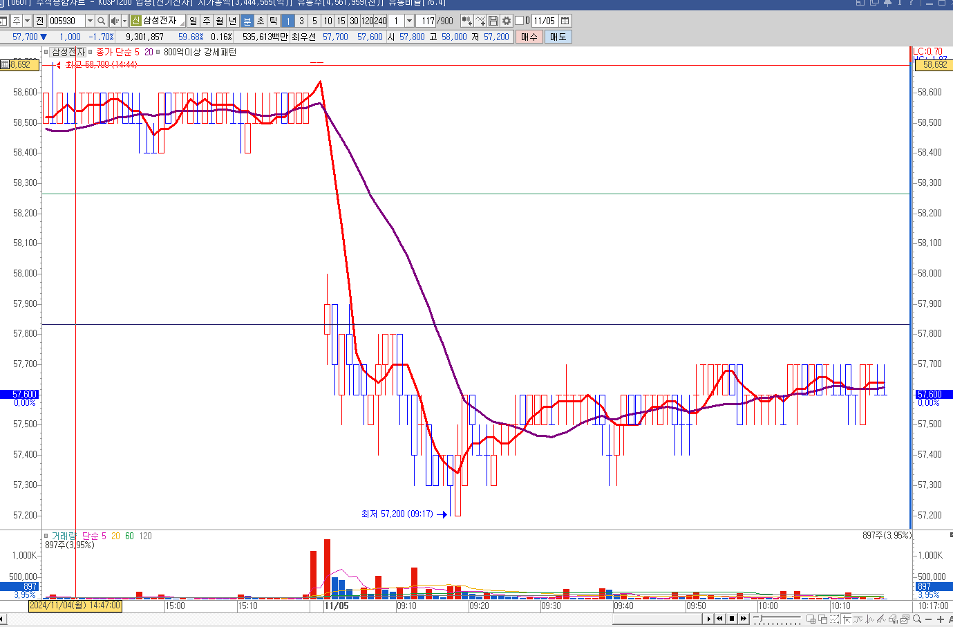 삼성전자를 보면 대부분 시가 외의 부근에서 갭을 만들어 올리거나 내리는 식의 차트를 그린다.