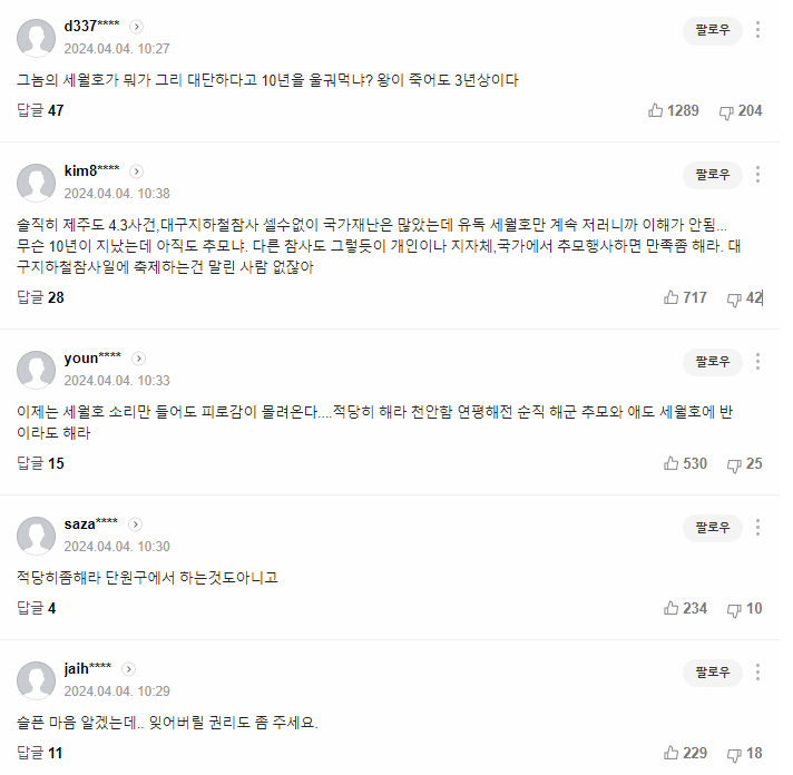 비극적인 일이긴 하다. 허나 국가적으로 이렇게 오래 혈세 쓰는 사건이 있었나 싶다. 물론 부모님들 생각하면 코멘트 달 수 없는건 맞지만 해당 일을 일파만파 확대시켜 지원금 받아먹는건 제3자인 시위 단체들이 아닌가 싶다.