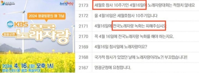 현재 영광군청 자유게시판에는 "전국노래자랑 날짜 변경해주세요" "국가적 참사가 있었던 날에 노래자랑이라니요" "꼭 4월16일에 전국노래자랑 녹화를 해야 하는지요" 등 시민들이 올린 항의성 게시글이 빗발치고 있다.