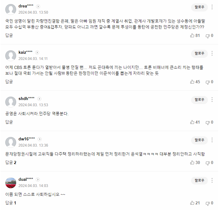 한편, 서민위는 공 후보 말고도 더불어민주당 한정애 서울 강서구병 후보, 박용갑 대전 중구 후보, 양문석 경기 안산갑 후보와 조국혁신당 비례대표 1번 박은정 후보도 함께 고발했다.