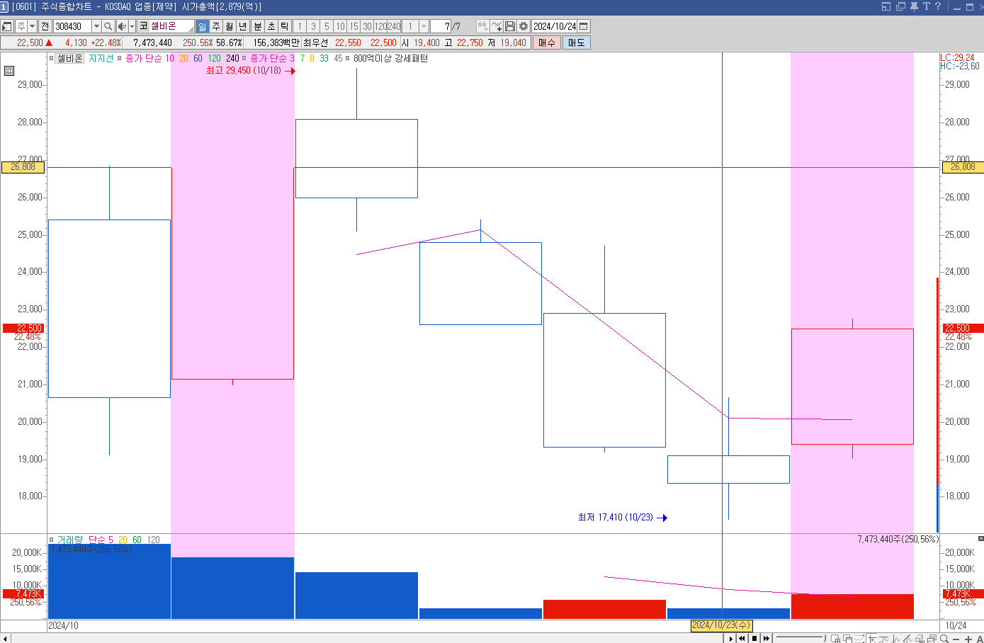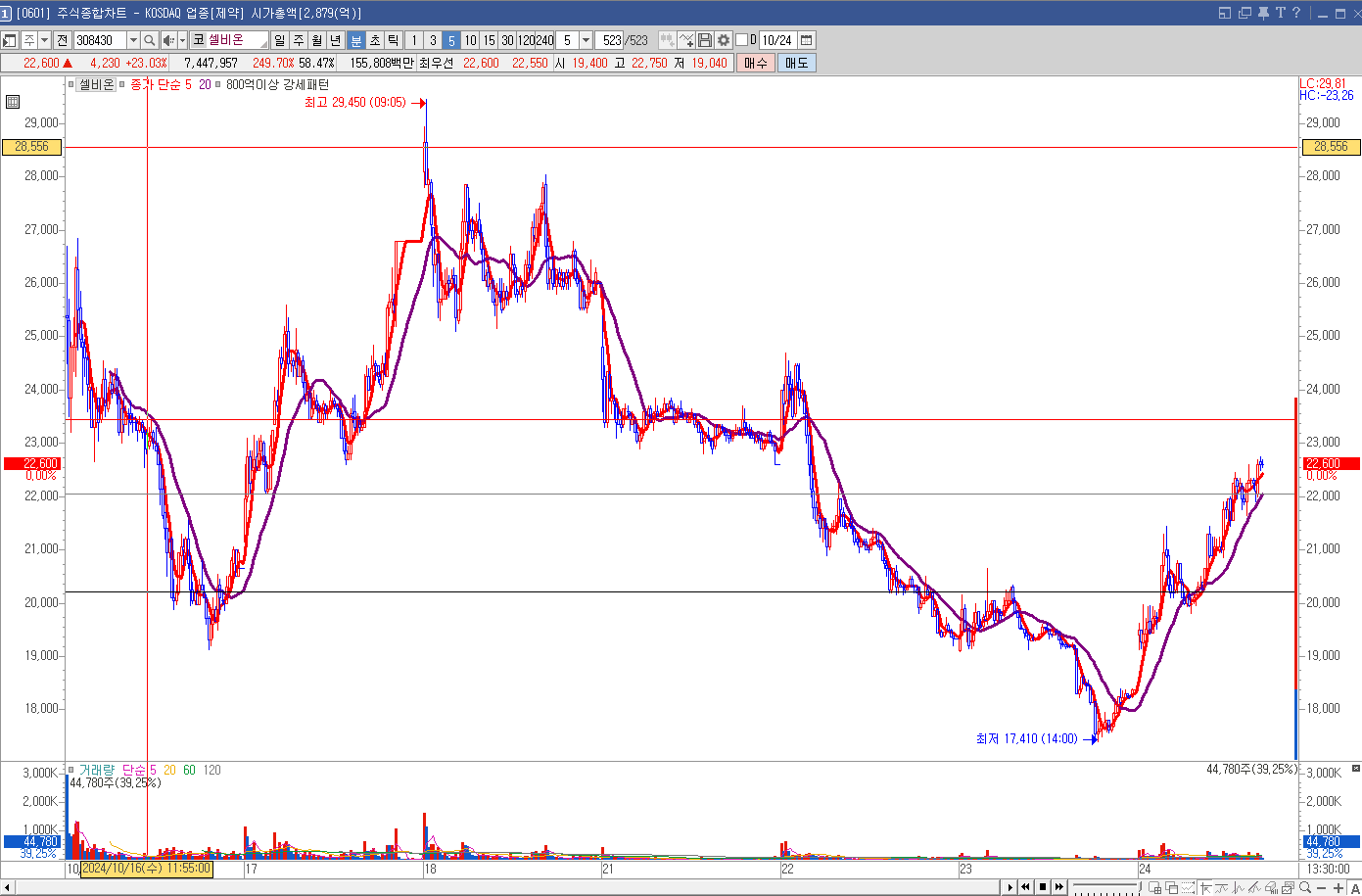 5분봉으로 보시면 하락 거래에서 거래량이 터지지 않았다는 걸 알 수 있습니다.