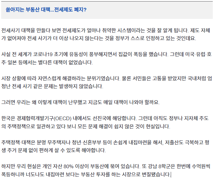 최근 정부에서 전세를 없애는 것이 맞다는 표를 했었는데 사실 동의하지 않는다.