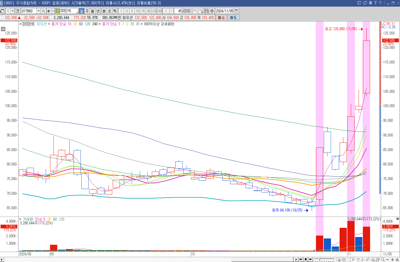 역시 마찬가지로 상한가 이후 잠시 조정 하는듯하다가 시세분출하고 있습니다.